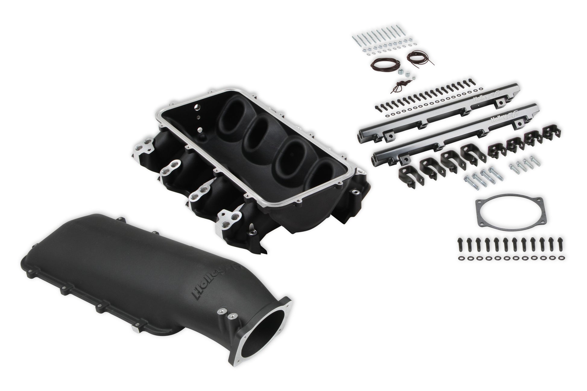 The LS3/L92 Lo-Ram manifolds base intake manifold is designed with a low height to aid the packaging of a plenum mounted air-to-water intercooler for forced induction (supercharged or turbocharged) engine applications with peak power at 7000-8000 rpm. The Holley LS3 Lo-Ram intake manifold kits are designed for GM LS Gen III and IV engines equipped with GM LS3/L92 cylinder heads. These intake manifolds will work with OE or aftermarket cylinder heads. The Lo-Ram intake manifolds are designed for forced induction (supercharged or turbocharged) engine applications and the 105 mm throttle body part number 112-581 or similar models. The base intake manifold is designed with a low height to aid the packaging of a plenum-mounted air-to-water intercooler. Additional manifold designs include both single and dual injector options. Available with both as-cast satin and black power-coat finishes. High volume fuel rails for eight and sixteen injector configurations. Mounting hardware included with 3/4-16 O-ring ports (8 AN)